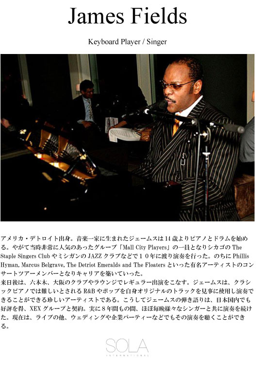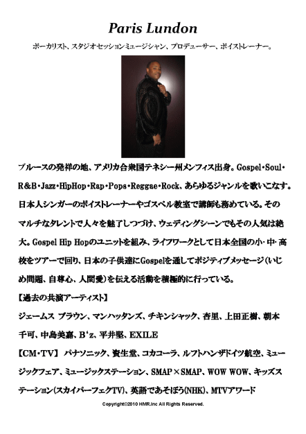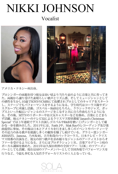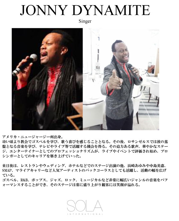 HOME | シンガー紹介 | その他ミュージシャン | その他演出 | ご予約の流れ・料金 | お問い合わせ | ギャラリー・お客様の声 | スタジオミュージシャン・楽曲提供