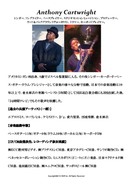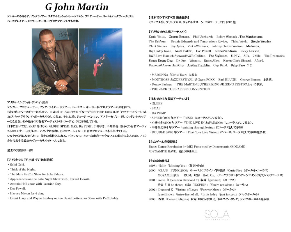 全てのミュージシャンが有名アーティストのコンサートツアーやレコーディングなどで日本国内のみならず世界各国でも活躍しているプロフェッショナルです。 HP上で紹介されていないアーティストも大勢おりますので、まずはお気軽にお問合せ下さい! ![]()