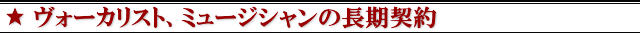 ![]() 弊社に所属するヴォーカリストやミュージシャンはこれまで多くの著名アーティストのバックコーラス、時にはリードヴォーカルとして数々のステージに上がってきました。ヴォーカリストとしてはもちろんのこと、ベースやキーボードなど楽器奏者としてもプロフェッショナルなミュージシャンが所属しております。全国規模の長期ツアー契約もご相談下さい。